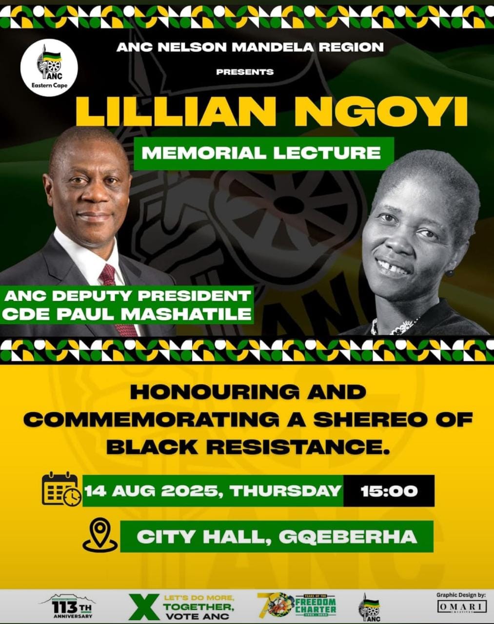 ANC Deputy President , Cde Paul Mashatile, will deliver the keynote address at the Lillian Ngoyi Memorial Lecture at Gqeberha City Hall in Nelson Mandela Metro today Thursday, 14 August 2025. The lecture will honour Mama Lillian Ngoyi, a fearless freedom fighter who sacrificed her life in pursuit of the liberation of the downtrodden masses of our people.